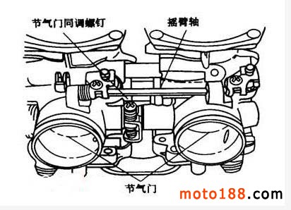 (4)若真空度的差值過大時,應確認各缸化油器的怠速調(diào)節(jié)螺釘都被調(diào)整在標準的返回圈數(shù)以內(nèi),旋轉(zhuǎn)節(jié)氣門同調(diào)節(jié)螺釘進行同步調(diào)整(如上圖所示),同時確認兩節(jié)氣門應在同一開關位置。調(diào)整完畢,應將左、右缸進氣管的工藝螺釘重新裝好,擰緊。