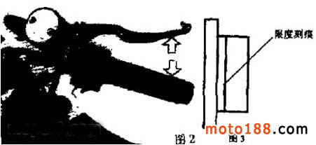 三、檢查制動墊片  檢查制動墊片的要領(lǐng)是看該片是否磨損到限度刻痕。如圖3所示,如果磨過刻痕就應(yīng)該換新的制動片。制動片須整套更換,否則制動性能反而會受影響。