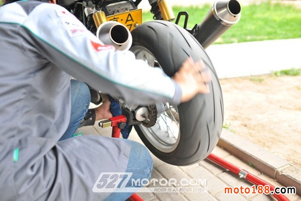如果您的愛車有大支架,可以先支起大支架,或者用后輪起撐架進行固定,然后再用MOTOREX Chain Clean Degreaser專用鏈條清潔劑,將噴劑完全噴灑、涂布在鏈條上。