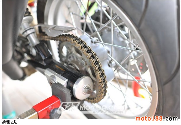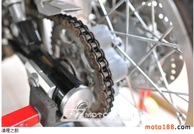然后靜待約兩分鐘,使清潔劑完全滲透到鏈條內(nèi)!接著在用抹布包住鏈條,然后轉(zhuǎn)動后輪使鏈條與抹布磨擦,將臟污完全清除。進行過多次的清潔之后,便可以發(fā)現(xiàn)鏈條恢復昔日光亮的一面。