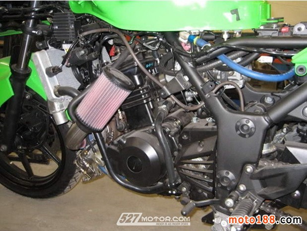 當(dāng)然,要想安裝這個(gè)完全不屬于小忍者的渦輪增壓是很困難的,在經(jīng)歷重新設(shè)計(jì)節(jié)氣門(mén)、渦輪進(jìn)氣通道、噴油器后,車(chē)主終于將渦輪增壓安裝在小忍者上,令人驚訝的是,車(chē)主居然將三菱汽車(chē)Lancer的節(jié)氣門(mén)安裝在本車(chē)上,渦輪也使用了兩家工廠的產(chǎn)品,分別是Garrett和IHI,噴油裝置則使用Bosch產(chǎn)品。為避免發(fā)動(dòng)機(jī)過(guò)熱,車(chē)主不得不降低壓縮比,為提高性能車(chē)主也在原有散熱器上安裝中冷器進(jìn)行降溫。最終這臺(tái)Ninja 250在測(cè)試中竟然輸出58.2匹馬力,足足比原車(chē)高了近30匹。國(guó)內(nèi)擁有Ninja的車(chē)友可以試試這套改裝方案!