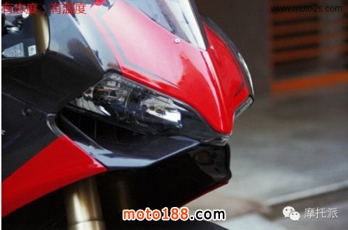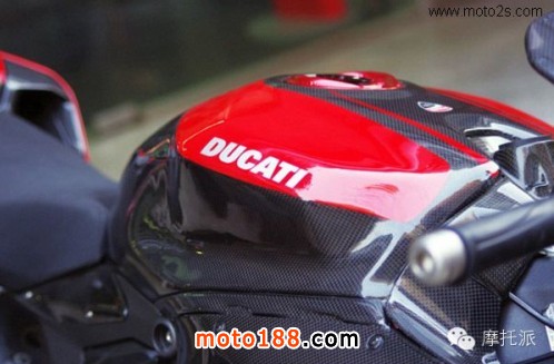 核心提示:犀利的車頭猶如張開血盆大嘴的鯊魚,碳纖維改裝件已經(jīng)取代了原車的進(jìn)氣、包板和頭罩,同時(shí)全新的配色方案讓杜卡迪紅和碳纖維完美