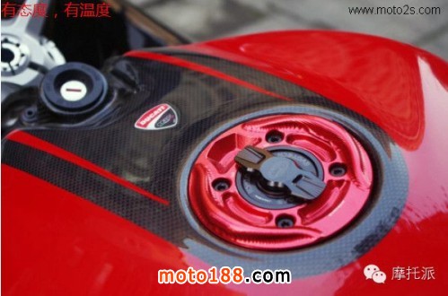 Ducati Corse的LOGO下面是EVOTECH快啟油箱蓋,出色的CNC切削工藝,增加了車輛的肌肉感,還非常實(shí)用。