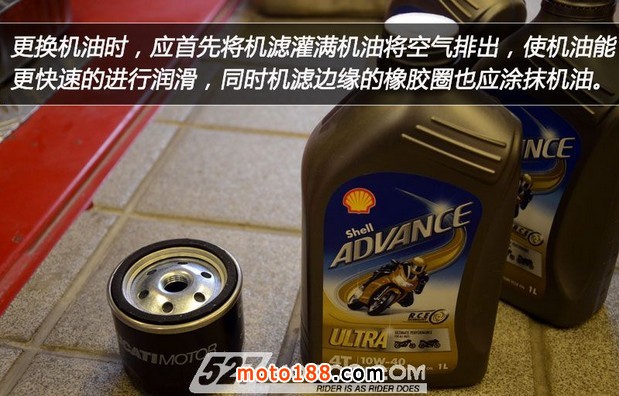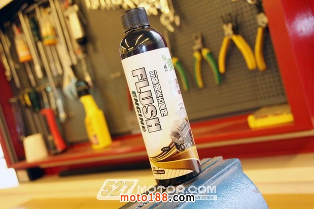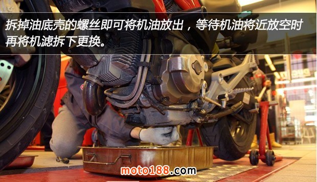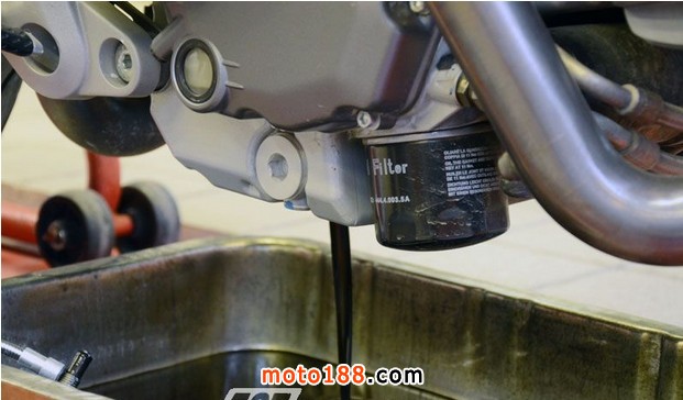 通常更換機(jī)油前,為了將機(jī)油盡可能的排干凈應(yīng)先將車打著運(yùn)行15分鐘,讓發(fā)動(dòng)機(jī)達(dá)到工作溫度,從水溫表、油溫表上觀察發(fā)動(dòng)機(jī)是否處于正常狀態(tài)。而為了更徹底的排出發(fā)動(dòng)機(jī)內(nèi)部的雜質(zhì),本次Monster 795更換機(jī)油前首先加入了發(fā)動(dòng)機(jī)油泥清洗劑,然后著車運(yùn)行5-10分鐘后將機(jī)油排出,再進(jìn)行更換機(jī)油濾芯的作業(yè)。