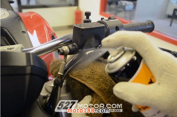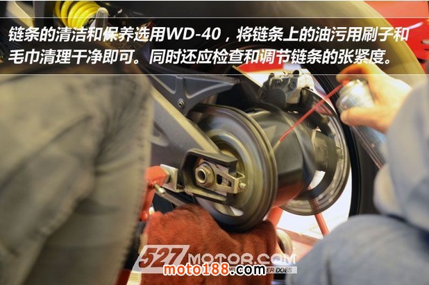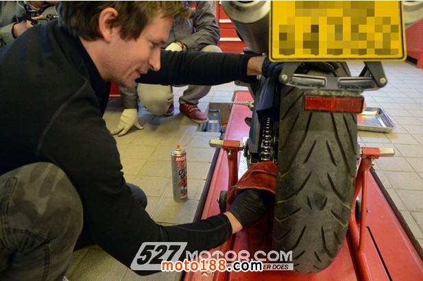 杜卡迪中國(guó)售后技術(shù)經(jīng)理Timothy Jones Kremlick親手示范鏈條養(yǎng)護(hù)