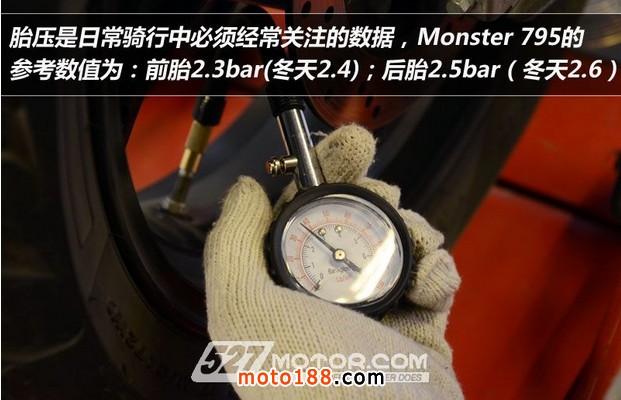 輪胎對(duì)于摩托車的性能和安全有著直接而重大的影響,一般輪胎的使用壽命約為3-5年,即便不騎橡膠也會(huì)老化變硬從而影響抓地力。因此,如果輪胎達(dá)到使用年限,而紋路等都沒(méi)達(dá)到需要更換的程度,也要進(jìn)行更換。而本次保養(yǎng)的Monster 795雖然還未達(dá)到更換輪胎的階段,但是杜卡迪技師還是為兩條輪胎做了軟化處理,在防止輪胎硬化的同時(shí)也可延長(zhǎng)輪胎的使用壽命。作完這項(xiàng)輪胎養(yǎng)護(hù)須停放24小時(shí),否則輪胎會(huì)出現(xiàn)打滑。