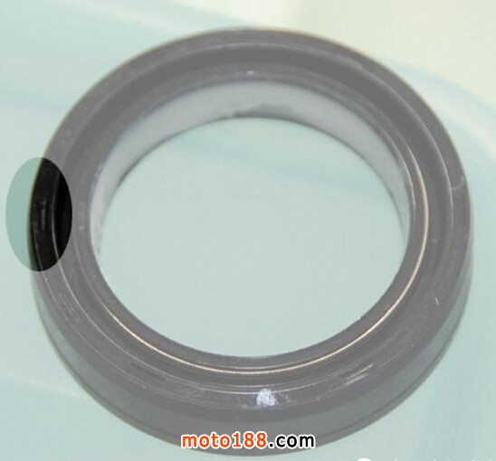新油封拿在手里一看,麻煩了,不知道正反面。仔細(xì)一看上邊是有個(gè)小槽子標(biāo)記。然后我找到舊油封一看,有同樣的標(biāo)記。那就好辦了。原來(lái)是槽子朝上的,新油封按照這個(gè)方向放進(jìn)去: