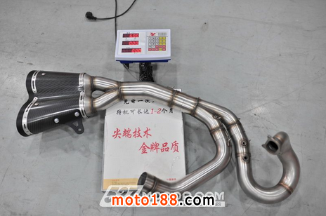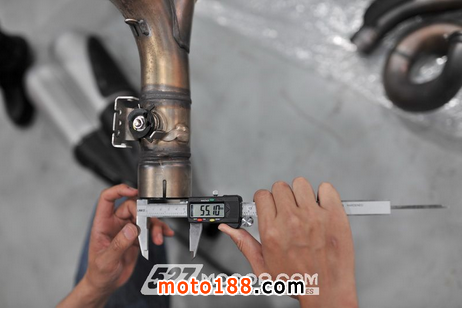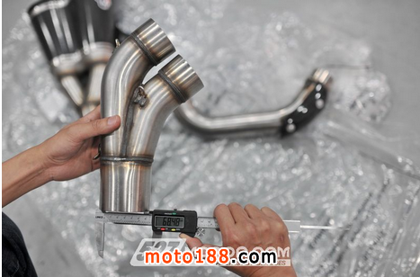 無論是改裝排氣還是原廠排氣,都是采用2-1-2的方式設計,不過在排氣的管徑上則有些為的差異。Termignoni在頭段、中段的排氣口徑,基本上與原廠排氣并無太大差異。原廠排氣在頭段的前、后缸的的口徑分別為--mm/55mm(第一缸的出口因為是扁口所以無法進行量測)、58mm/55mm,而Termignoni的前段口徑則為--mm/54mm、58mm/54mm。在中段的部份,前后兩缸匯集在一起,原廠口徑為58mm/55mm,而Termignoni口徑為57mm/68mm。而在尾段方面,Termignoni排氣僅為原廠排氣的1/3,可想而知Termignoni內(nèi)管并沒有太多回壓的阻力與隔板,幾乎為直通管!在口徑方面,原廠管口徑僅為58mm,Termignoni改裝口徑則達到了70mm。