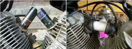化油器清洗完裝機(jī)試車(chē),發(fā)現(xiàn)咋樣調(diào)還是不行,太老了,狀態(tài)太差了,上網(wǎng)上一看力帆的雙化要380還不包好,太貴了,想到改個(gè)單化試試,找了個(gè)GY6的雜牌化油器,把電子風(fēng)門(mén)去掉人為的關(guān)掉,兩缸的連接管得做一個(gè),哈哈先做了兩個(gè)紙管,試一下角度,不過(guò)試過(guò)發(fā)現(xiàn)這種做法很麻煩,取材不容易,本著簡(jiǎn)單易用的原則,發(fā)現(xiàn)把原來(lái)的化油器接口膠轉(zhuǎn)一個(gè)角度,再找個(gè)三通管子就行了,去賣(mài)PVC管件的地方幾無(wú)錢(qián)買(mǎi)了一個(gè),修改了一下,哈哈成功了。通過(guò)試驗(yàn),發(fā)現(xiàn)單化怠速很穩(wěn),省去了調(diào)雙缸平衡的麻煩了,下面上圖。
