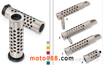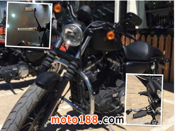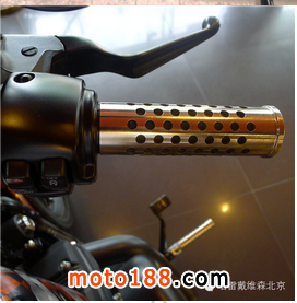硬漢的車把改裝后別具特色。車把由原來彎曲的內(nèi)彎式改為直把,兩個(gè)車把從車軸分別向外平直伸出,車把簡(jiǎn)潔微小的彎度讓騎手更容易操作扭轉(zhuǎn)。不僅如此,把手改用了消音器式不銹鋼把手,一方面顯示出剛硬與猛烈,另一方面,把手上有規(guī)律的小孔排列一起,極具美感。手握這樣的把手,讓人感覺似乎可以控制一切。與把手相同的是,腳踏也改為消音器式腳踏。而且腳踏由原來的中置腳踏前移改為前置腳踏,以便讓騎手的腿部自由伸張,使身體在駕車過程中更加舒展。