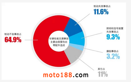 據(jù)交警部門統(tǒng)計(jì),車輛性能交通事故主要由于使用假冒偽劣零配件造成,其中制動(dòng)不良事故占64.9%、制動(dòng)失效事故占11.6%、照明和信號(hào)裝置失效事故占9.3%、爆胎事故占3.2%。