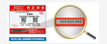 豪爵純正部品是唯一確保豪爵鈴木摩托車整車完美性能的專業(yè)部品。豪爵純正部品均采用電碼防偽技術(shù),機(jī)油標(biāo)貼和配件標(biāo)簽上均有一個(gè)16位或17位的防偽識(shí)別碼,且具有唯一性,不易破譯。用戶購買后,可刮開防偽涂層,按以下四種方式輸入密碼查詢真?zhèn)巍?br />