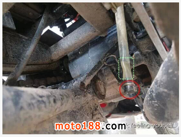 圖里綠色虛線方框里就是水蒸汽液化后的水分,為使該水分不回流到發(fā)動(dòng)機(jī)里,摩友們需定期檢查并將紅圈的堵頭取下,將水分排出,然后將堵頭裝回(裝回堵頭是避免泥污、顆?;覊m通過(guò)該管道進(jìn)入發(fā)動(dòng)機(jī)內(nèi)部)。