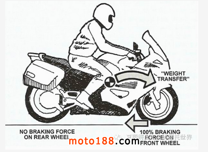 因?yàn)檐囆捅旧磔S距較短,運(yùn)動(dòng)型摩托車重量轉(zhuǎn)移到前輪的速度比巡航車型要快得多,重量從后輪轉(zhuǎn)移到前輪上的速度太快,后輪和地面的摩擦力就會(huì)很快不足,后剎就會(huì)很快沒有效率,剎車力無法通過摩擦有效的傳導(dǎo)到地面上,就會(huì)很容易造成抱死和側(cè)滑。這也就是大部分賽車手和賽道騎士避免使用后剎的原因。