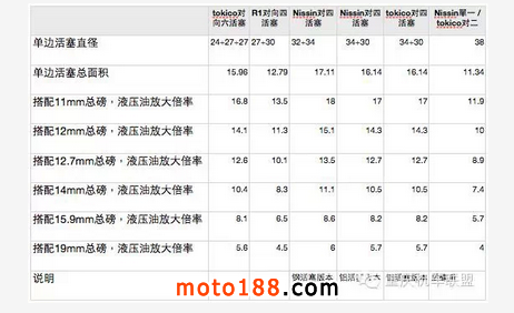 了解了原理以后,我們?yōu)榱艘窒苈放蛎洉r(shí)候所吃掉的油量,所以上磅的出油量一定要有一定的比例,所以口徑越大不一定越好的觀念,在這里可以得到證實(shí)。一般放大功率多半車廠都會(huì)選擇盡量不低于10倍,如果低于十倍,代表你的剎車力到手的力量要很大,但是如果高于17倍,你就得考慮到剎車系統(tǒng)的精密度了,如果功效倍率那么大,精密度卻不夠那也會(huì)導(dǎo)致剎車失靈。因?yàn)闀?huì)產(chǎn)生過大的間歇,也就是出油量過低。