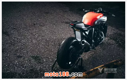 “紅外線”采用了一個(gè)Cafe直線加速賽車的外觀造型,原有的VMAX外觀風(fēng)格已經(jīng)幾乎消失。車身的圖案,使用了1985年 Yamaha GP車隊(duì)的配色。主要的改裝,則包括了以精湛工藝全人手制作而成的鋁合金副車架;精雕細(xì)琢之下的油箱安裝設(shè)計(jì),讓大幅改動(dòng)之后的“紅外線”依然維持了標(biāo)準(zhǔn)車原有的油箱容量以及乘坐體驗(yàn);鋁制外殼的車身兩側(cè)空氣濾清器;定制的Termignoni四出一排汽系統(tǒng);多處的碳纖維組件等等。