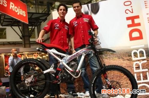 在西班牙巴塞羅那某年車展當(dāng)中,DERBI DH2.0進(jìn)行全球首演。這一輛外型看似越野自行車的概念車,搭載了可輸出最大馬力8hp的100c.c.汽油引擎,加上僅有40kg的重量,重量馬力比達(dá)到5kg/hp。