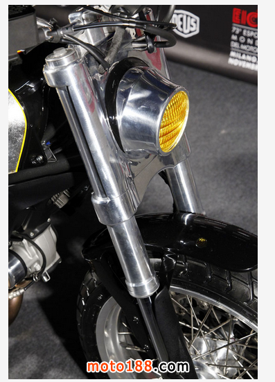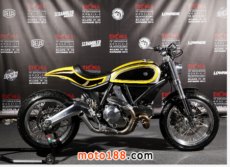下圖:由 Radikal Chopper 負(fù)責(zé)開發(fā),曾在 EICMA 2014 的定制車評(píng)比中獲獎(jiǎng)的 Scrumbler 定制車。