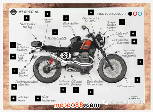 這組改裝套件可以讓V7更加滿足街車需求的同時,擁有越野車的個性外觀。專用鋁制絲質(zhì)拋光零件,二合一“箭牌”消聲器,越野輪胎,越野車把拉桿以及越野腳踏板。長絲質(zhì)拋光擋泥板、絲質(zhì)拋光車牌、絲質(zhì)拋光邊蓋、70年代復(fù)古長座墊將V7完美變身Scrambler。而且V7三款車型全部完美套用。