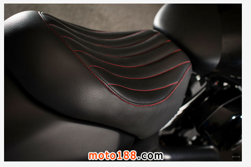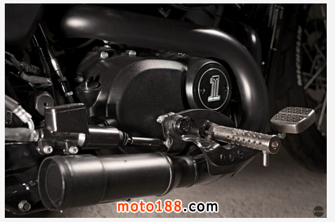 在原裝座椅上安裝了一個(gè)定制坐墊,重置了點(diǎn)火鎖和喇叭使外觀看起來(lái)更加簡(jiǎn)潔一體。在廉價(jià)摩托車(chē)上會(huì)看到的線(xiàn)束也被部分隱藏。中控噴上黑漆并打孔裝上了哈雷的“Silencer”腳踏。