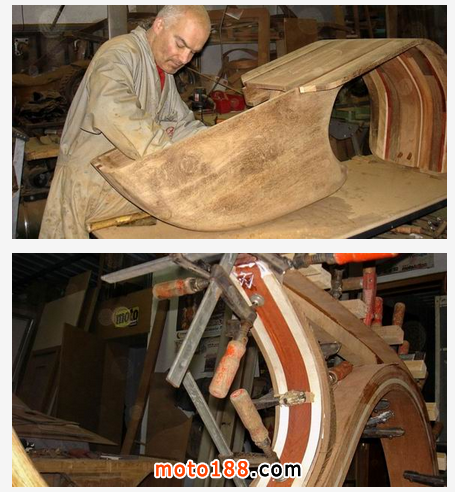 最大的挑戰(zhàn)相信就是給木頭材質(zhì)塑形的過程,數(shù)十只扳手齊心協(xié)力搞定了這一切。Carlos Alberto 為車身設(shè)計(jì)了漂亮的意大利Napolitan 條紋,無論是輪箍?jī)?nèi)部、腳撐、車把、坐墊、燈罩、坐架甚至車牌,全部運(yùn)用了木頭材質(zhì),配合上Napolitan 條紋足以令你心動(dòng)。突然好羨慕Daniela 有位這樣的父親!